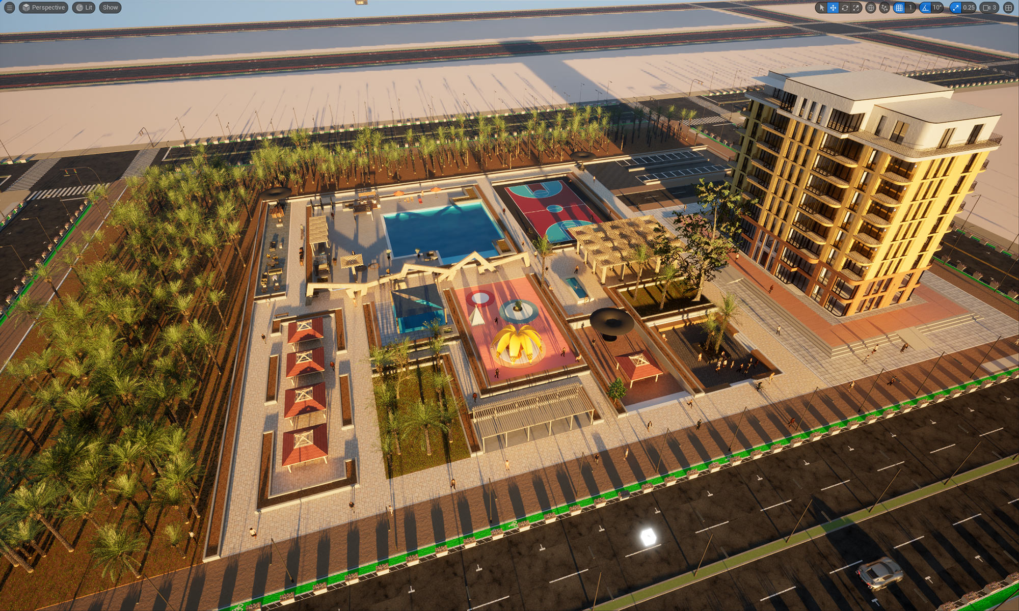Additionally, 3ds Max was used for detailed modeling of specific assets and architectural elements, while CityEngine contributed to generating procedural road networks and urban layouts, providing a solid and realistic foundation for the city environment within Unreal Engine.
